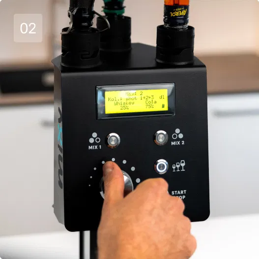 Using Mixy is simple. As the owner, you first set which drinks you’ve attached to the device or which recipe you want to pour. To pour a drink, you then turn the knob to adjust the ratio between the two drinks shown on the screen (e.g. Wine 50% / Water 50%). If needed, you can also select the desired volume by pressing the button (e.g. 1, 2 or 3 dl). When you’re happy with the ratio and amount, just press the START button and Mixy will serve your drink.